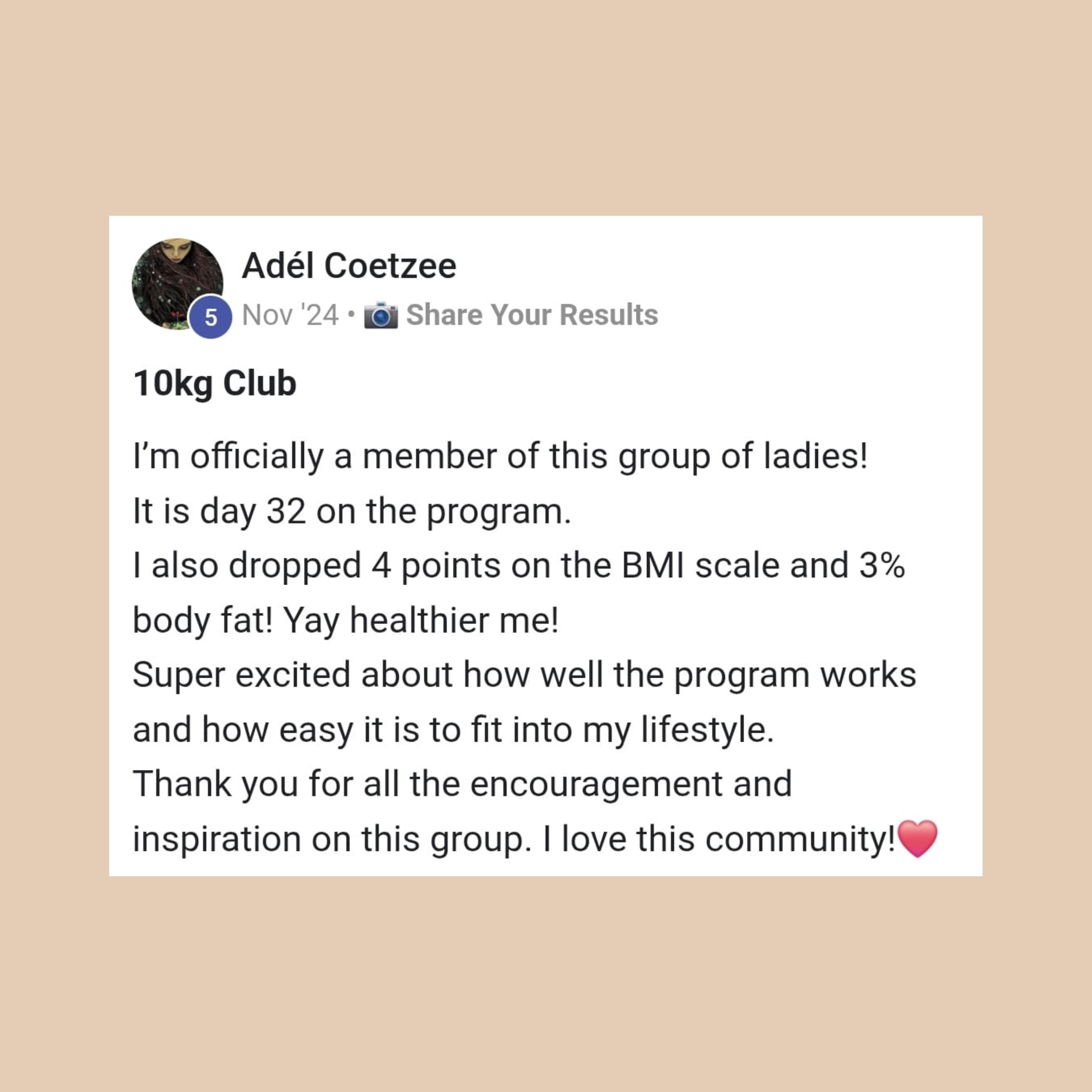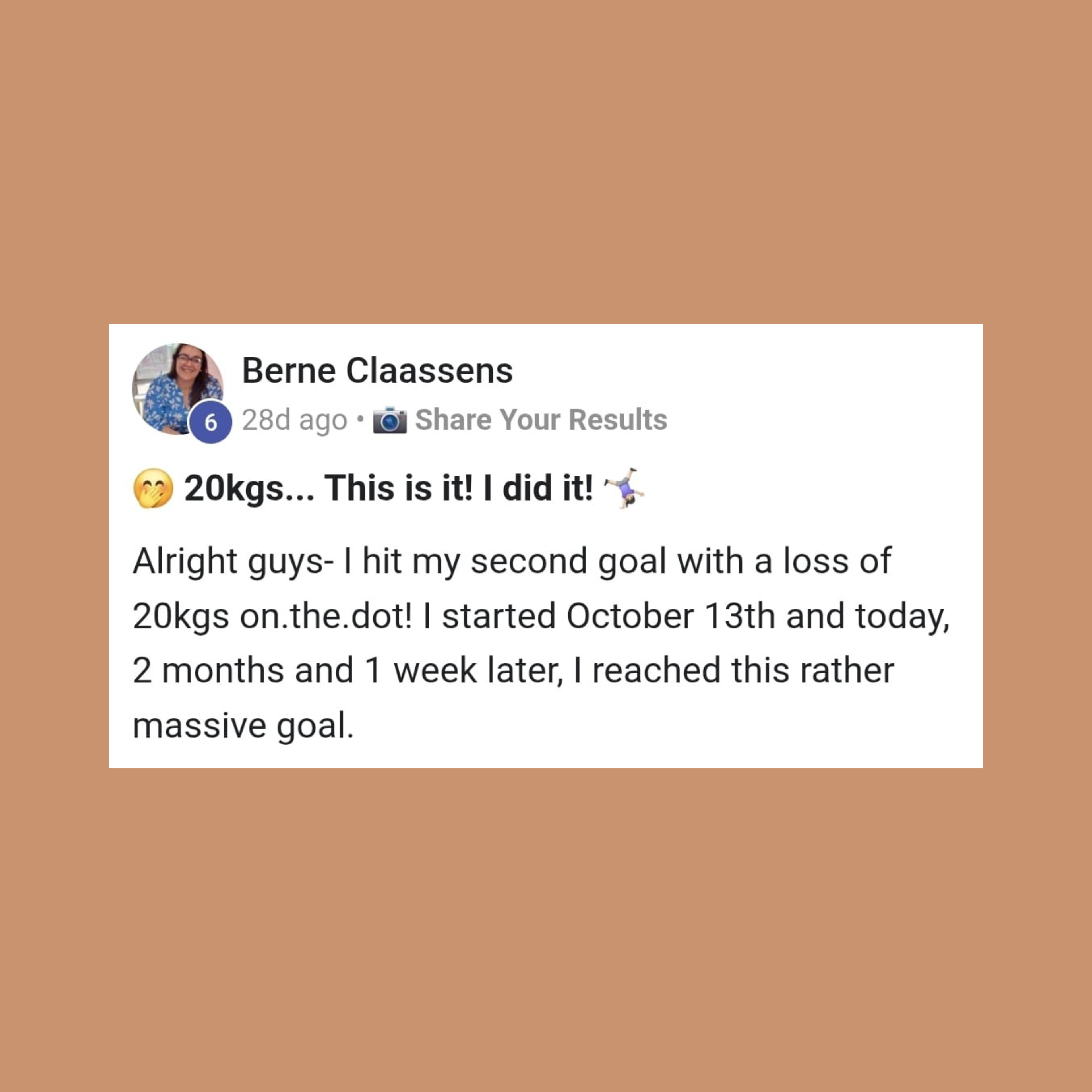 "They say a diet is like an ex boyfriend, that you should'nt go back - in this case, I am so happy I did! Through following the 28-day Shrinking Challenge, I have managed to lose the last few kilos thanks to the help of the No Crave drops. The challenge is so helpful in keeping you accountable and the support offered is like nothing I have experienced with any other diet" Yolande B.